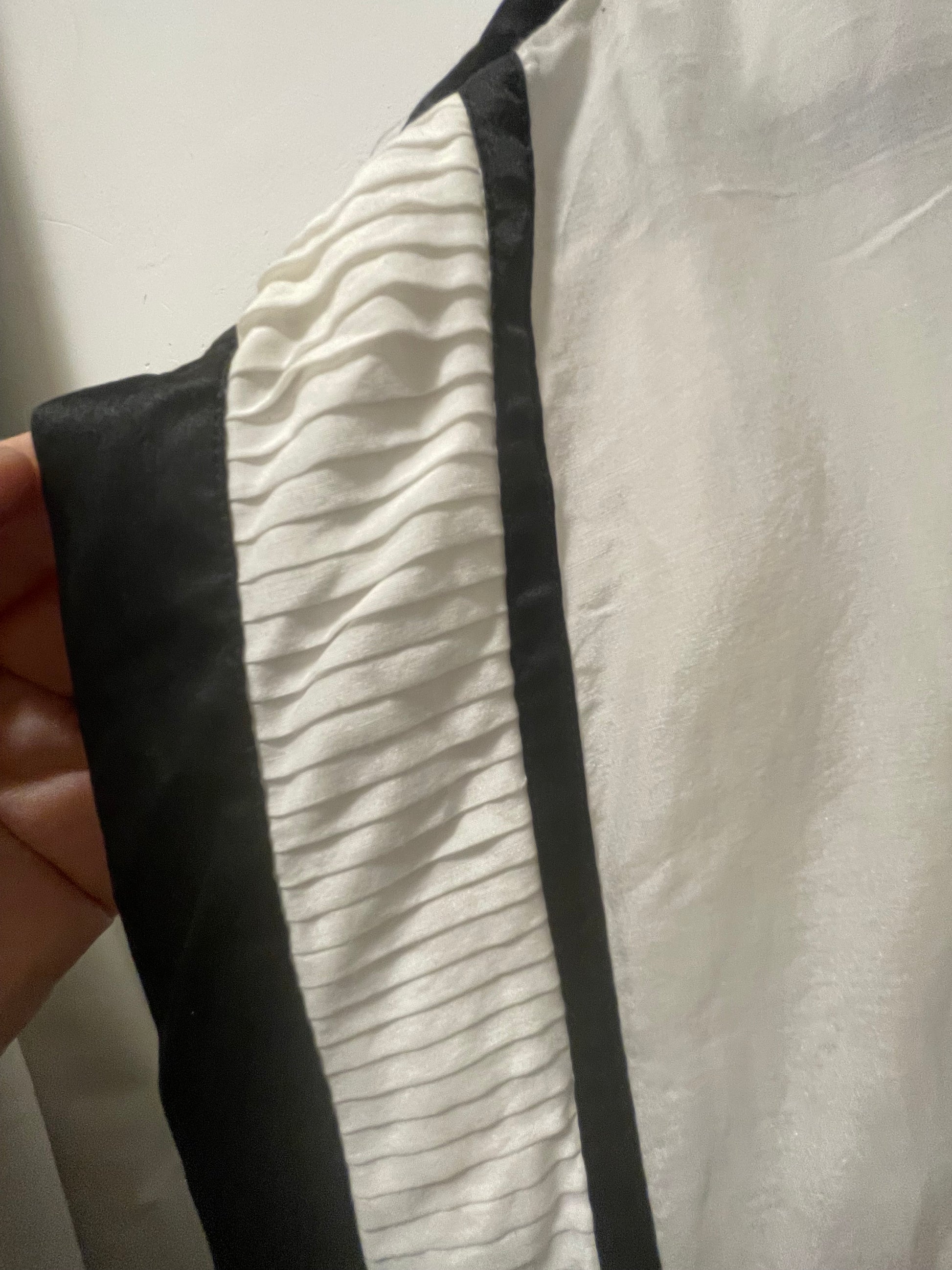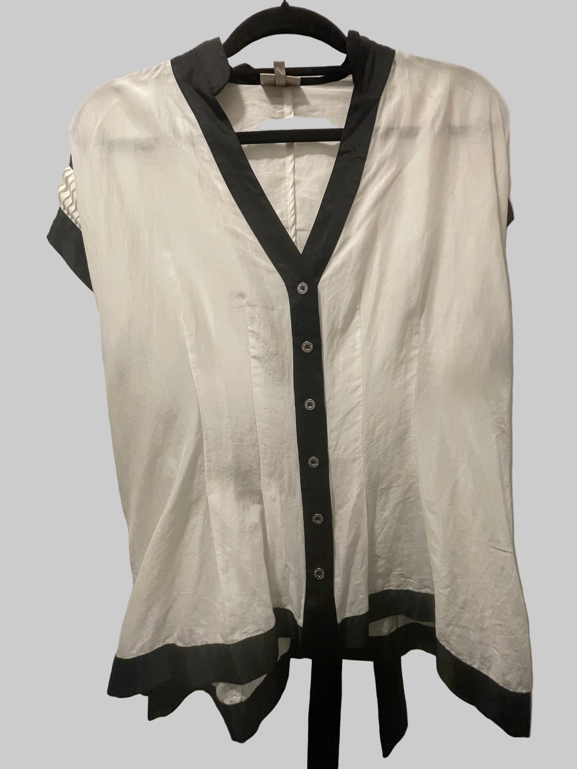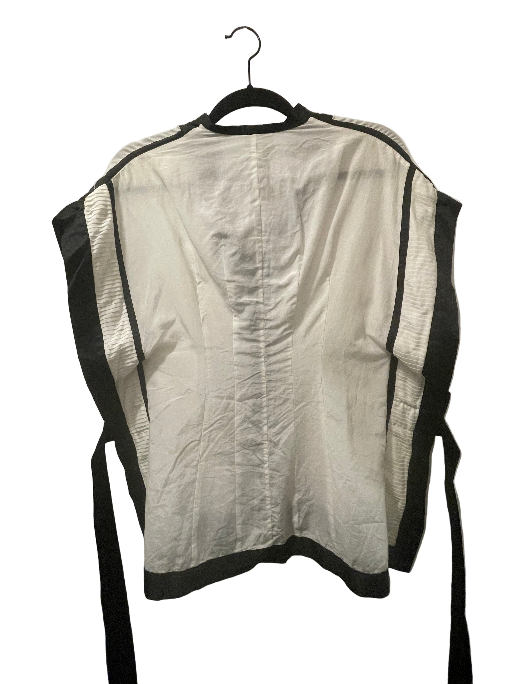 Stunning tailored designer blouse. Unique pleated detail to side seams. Contrast black sections. Tie belt.